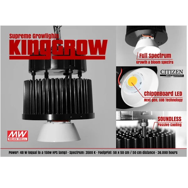 KING-GROW COB LED LAMPEN er baseret på den bedste COB (ChipOnBoard)teknologi der endnu er udviklet – der kan erstatte ethvert andet lyssystem med fordel. Lampen bruger kun 48 W, men yder effekt svarende til 150 W HPS. SPAR 70% på strømregningen med KING-GROW COB LED uden at gå på kompromis med afkast og kvalitet. KING-GROW COB LED har en levetid på 36.000…