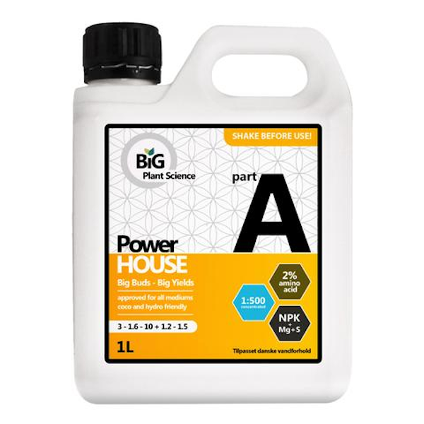 Part A, Power House er grundgødningen der leverer alle de makro-nærings stoffer planter har brug for. Der er tilsat 2% aminosyre der booster celle dannelse og forøger plantens evne til at optage gødning
